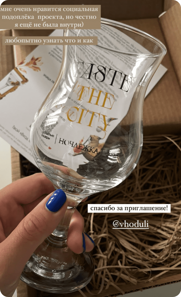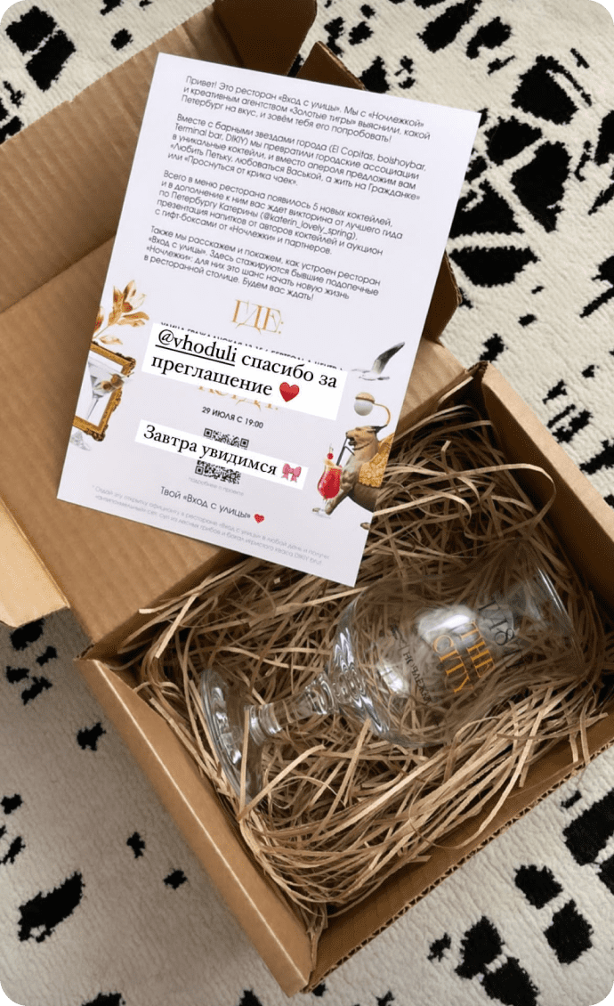 Мы выслали блогерам подарочные боксы с уникальным бокалом и открыткой, в которой приглашали их на мероприятие.